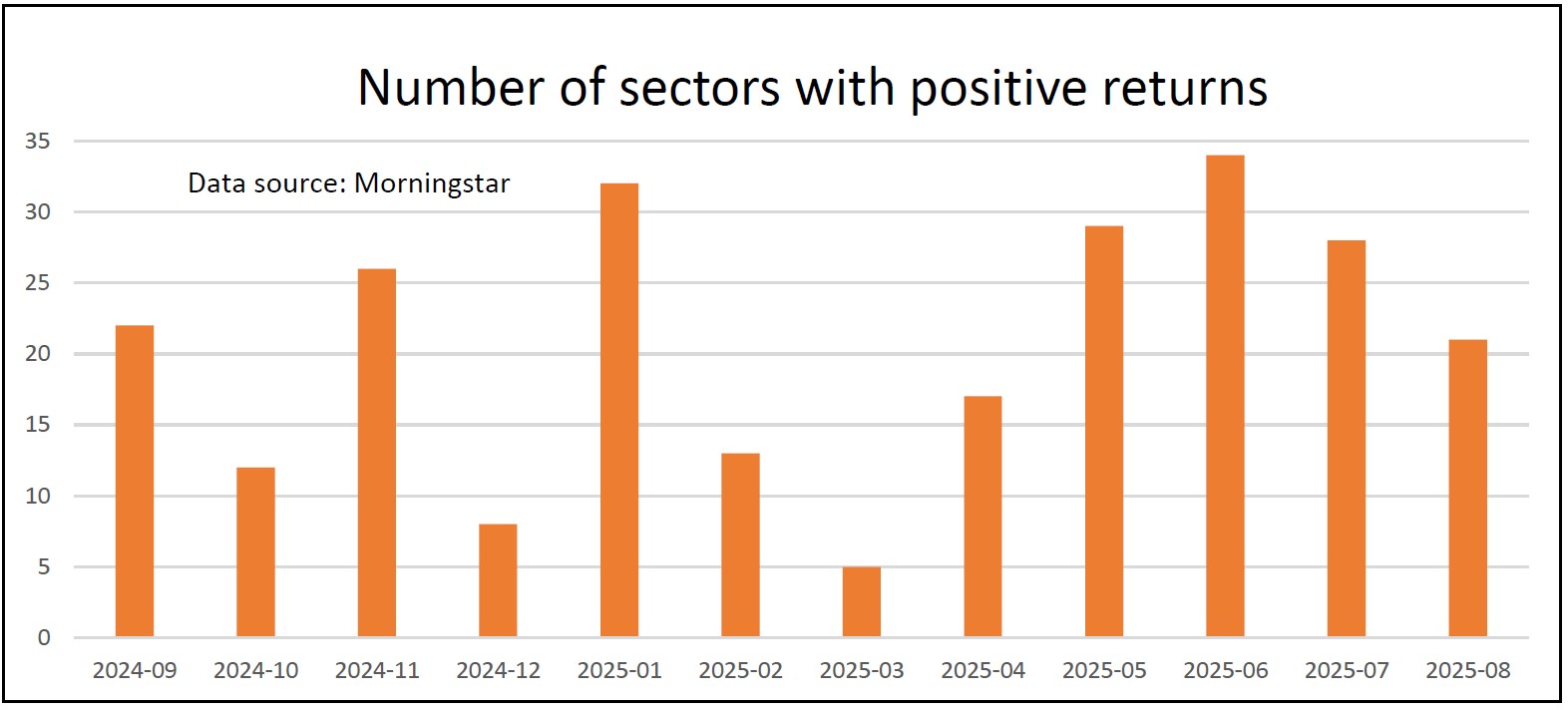 June was the best month we have seen for over a year, with all 34 sectors posting positive returns. In July the number dropped to 28, and last month it was 21. Still a reasonable result, but unfortunately starting to trend downwards.